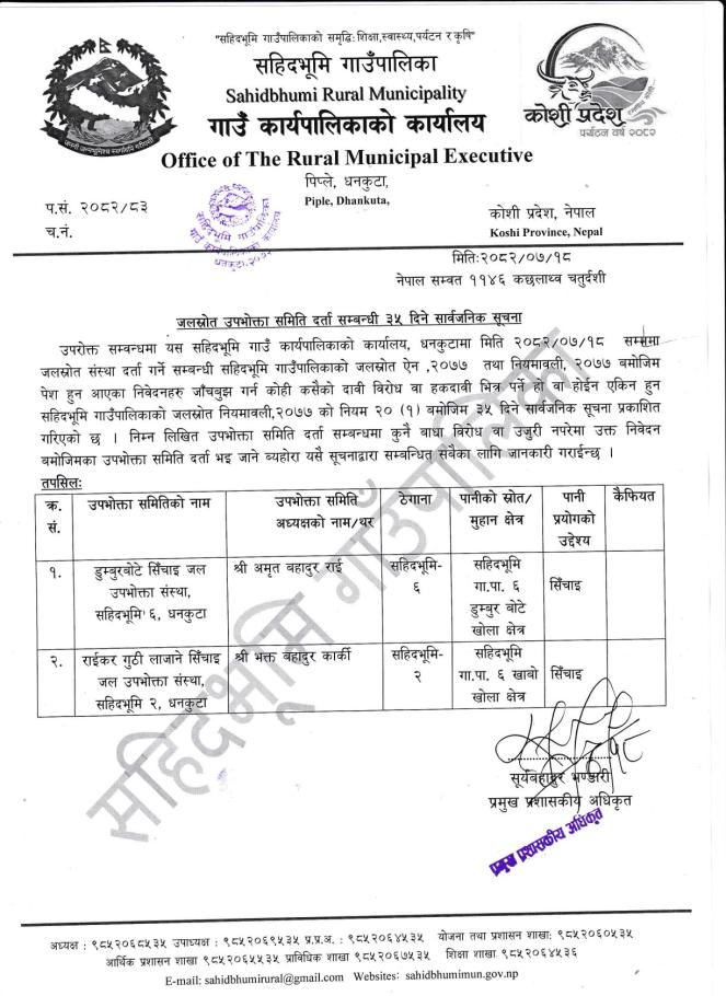 जलस्रोत उपभोक्ता समिति दर्ता सम्बन्धी ३५ दिने सार्वजनिक सूचना |