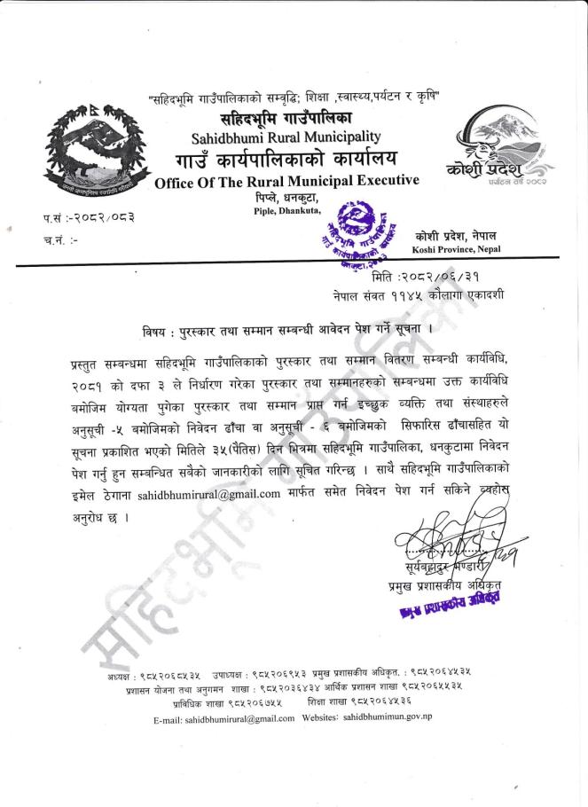 पुरस्कार तथा सम्मान सम्बन्धी आवेदन पेश गर्ने सूचना |