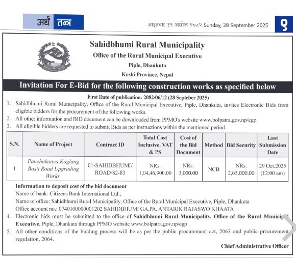 आन्तरिक आय ठेक्का बन्दोबस्ती सम्बन्धी सिलबन्दी बोलपत्र आह्वानको सूचना |
